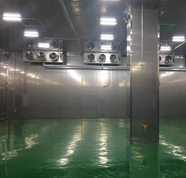 3、冷風機:定制冷風機共8臺,兩間庫房均采用四臺改裝工業型防爆高效冷風機,化霜形式采用熱氟除霜,,防爆等級ExdIBT4,每臺機組拖兩臺冷風機。