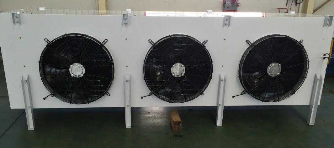 大型干式冷風機常為落式,落式冷風機主要由上、中、下三部分組成:落式冷風機下部是水盤,用來收集冷風機沖霜用水,并支承風機主體,同時又是空氣吸入口;上部為排風風帽,內(nèi)裝風機,風量和風壓要求去選用軸流式或離心式風機及其相應(yīng)臺數(shù),軸流式風機風壓一般比離心式風機低,但風量大多。風帽和管簇之間裝設(shè)淋水管,作為水沖霜之用。中間部分是一個空氣冷卻排管(蒸發(fā)管組),套片式冷風機來說,其冷卻管簇為D25×2.5mm無縫鋼管上,套有0.5mm鍍鋅鋼片或0.5mm鋁片套片管。